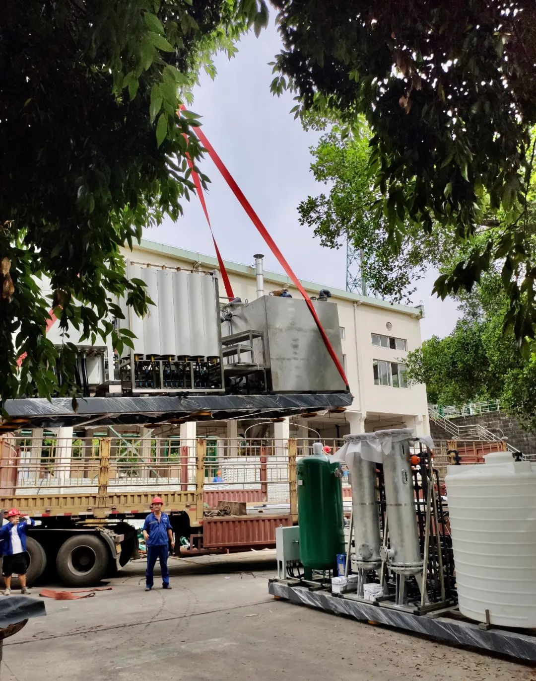 在安裝就位過程中,由于設(shè)備車間空間小,導(dǎo)致設(shè)備挪運(yùn)難度大,整個(gè)過程異常艱難,但碩特環(huán)保忠縣項(xiàng)目人員始終堅(jiān)持“迎難而上,堅(jiān)持到底”的原則,發(fā)散思維,就地取材,最終在土建方及業(yè)主的大力配合下,順利完成了就位工作。
