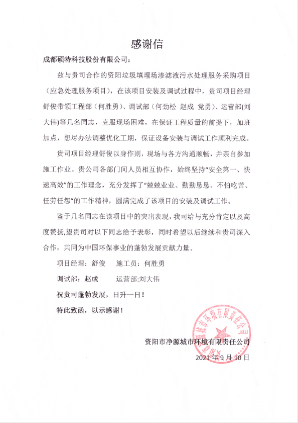 在資陽垃圾填埋場滲濾液污水處理服務采購項目的安裝、調試施工過程中,資陽項目組成員克服現場困難,在烈日下高溫下敷設管道、電纜。由于業(yè)主配電柜老化,現場兩臺空壓機無法使用,項目組積極與業(yè)主溝通,加班加點采購所缺元件、安裝管道并調試設備,在保證質量的前提下優(yōu)化工期,圓滿完成了該項目的安裝、調試工作,并贏得業(yè)主高度認同和贊揚。
